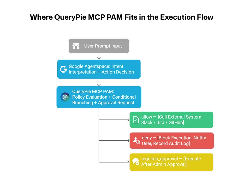 [User Prompt Input] │ ▼[Google Agentspace: Execution Platform] │ ▼[QueryPie MCP PAM: Policy Evaluation & Approval Workflow] │ ├─ Policy Satisfied → Allow Execution ├─ Policy Violated → Block Execution └─ Approval Required → Request Approval, Then Execute ▼[External System Execution: Slack / GitHub / AWS, etc.]This layered approach delivers a clear strategic message: